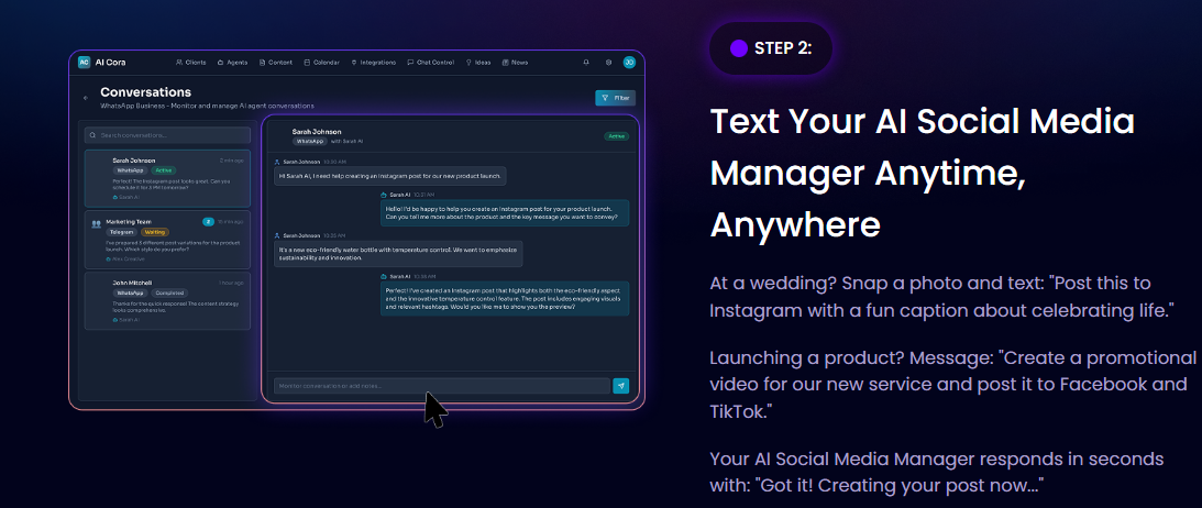 AICora can be managed through its dashboard or through WhatsApp, making it also function as a WhatsApp AI social media assistant. This means you can control your business growth from your phone, anytime, anywhere.
