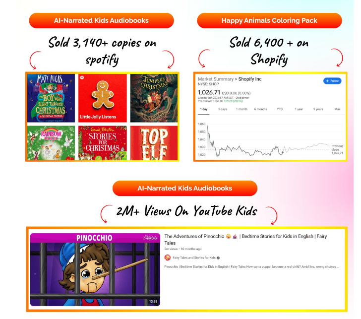 This feature allows users to turn one idea into multiple kids' products at once. A single concept can become a coloring book, ebook, audiobook, and video pack, increasing earning potential.